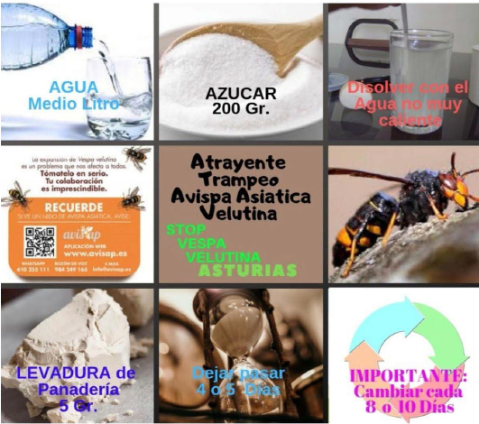 La Vespa velutina puede capturarse mediante trampas selectivas durante periodos concretos del año. Una receta de atrayente común combina: