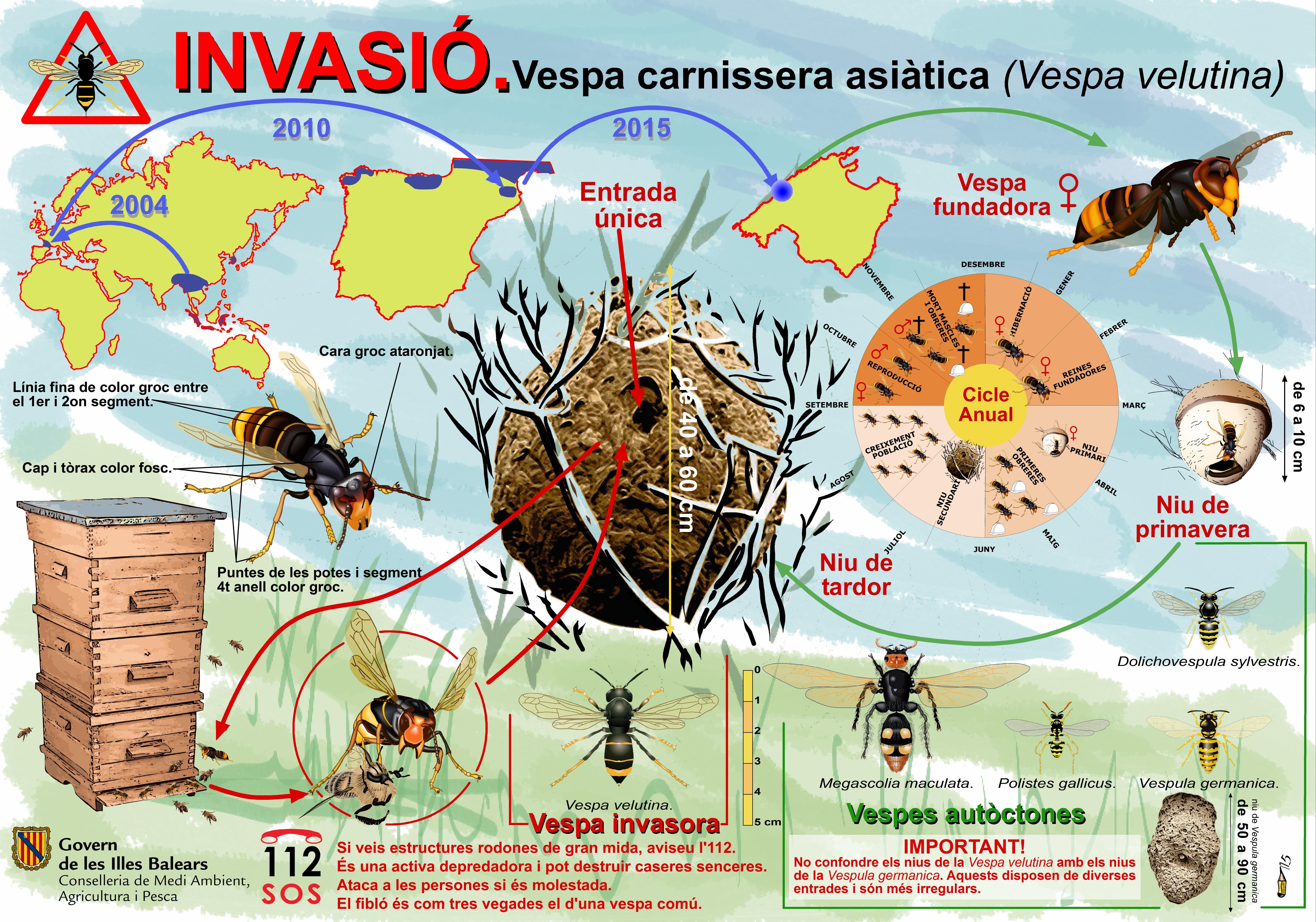 Ciclo anual, morfología y expansión (Govern Balear)Ver infografía a tamaño completoMaterial técnico oficial con información de identificación, biología, detección y actuaciones recomendadas para Vespa velutina y Vespa orientalis. Todos los documentos se abren en una nueva pestaña.